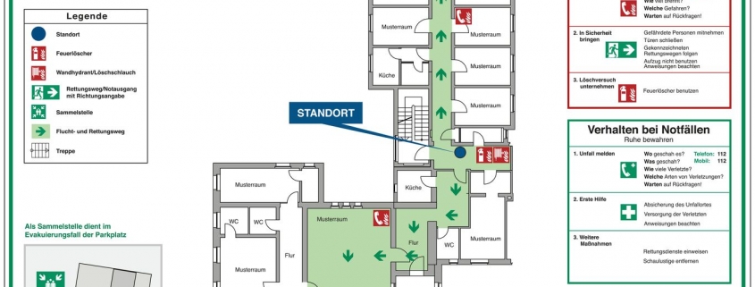 Flucht- und Rettungsweg: Darstellung der Fluchtwege, Notausgänge und Sammelstellen.